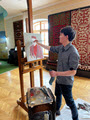 Суретші шеберлік сабағы барысында ұлттық әйел бейнесіндегі модельдің портретін салып, жұмыстың негізгі кезеңдері мен киім өрнектерін өңдеу тәсілдерін көрсетті.