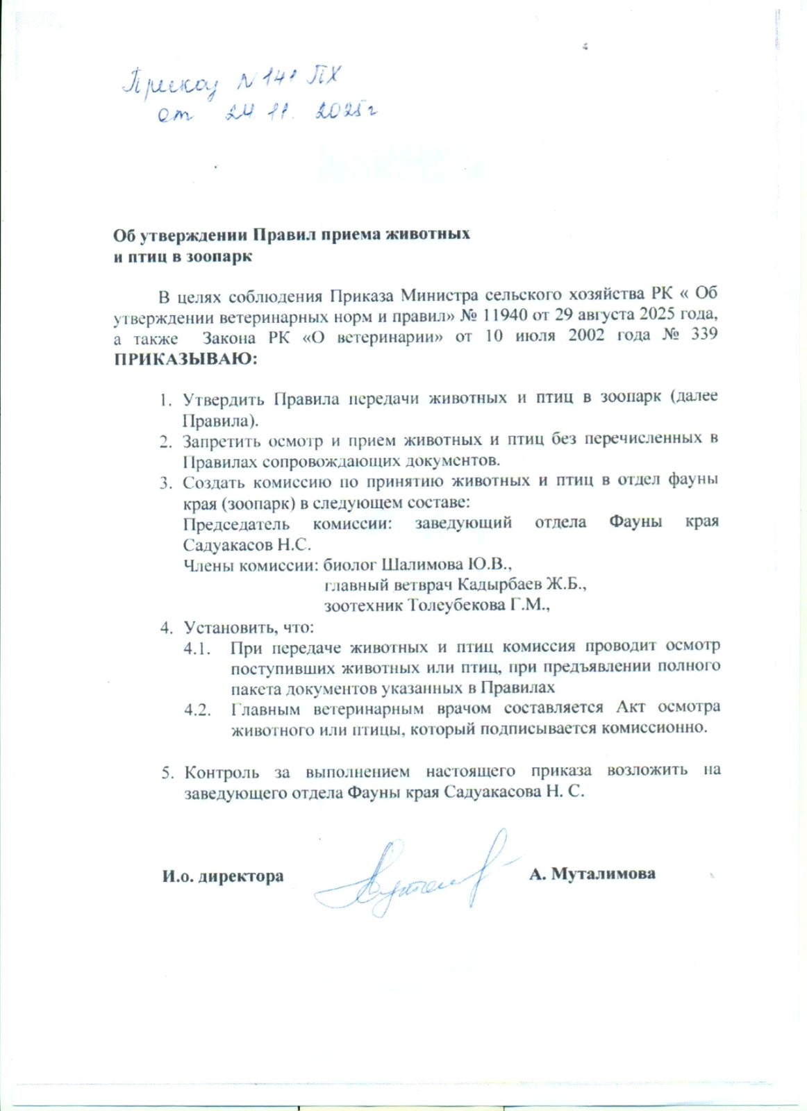 - Контроль за выполнением настоящего приказа возложить на заведующего отдела Фауны края Садуакасова Н. С.