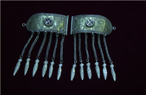 Состоит из двух основных частей прямоугольной формы, закругленных с двух сторон, и двенадцати подвесок на цепочках.