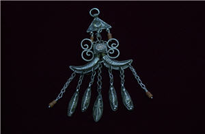 В нижнюю часть прямоугольника вставлены когти филина в металлической оправе, украшенной параллельными полосками. К металлической оправе прикреплены семь подвесок на цепочках (длина - 6,8 см), пять пиковидных, две – с двумя бусинками из коралла.