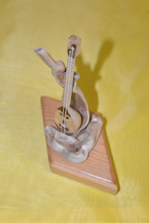 1. «Домбыра» шағын мүсіні, кәдесый деп атауға болады. Қорға түскен жыл 2018, Нв 24-13190. Тұғырға бекітілген ағаш тамыры мен домбыра мүсінделген. Ағашты өңдеп ойып жасаған, ою өрнекпен безендіріп лажыланған. Жалпы домбыра-мойын, шанақ және құлақтан тұратыны белгілі, қарапайым ақ жіп арқылы ішегі мен пернелерін жасаған. Өлшемі: 18х20 см. Лажымен көмкерілген.