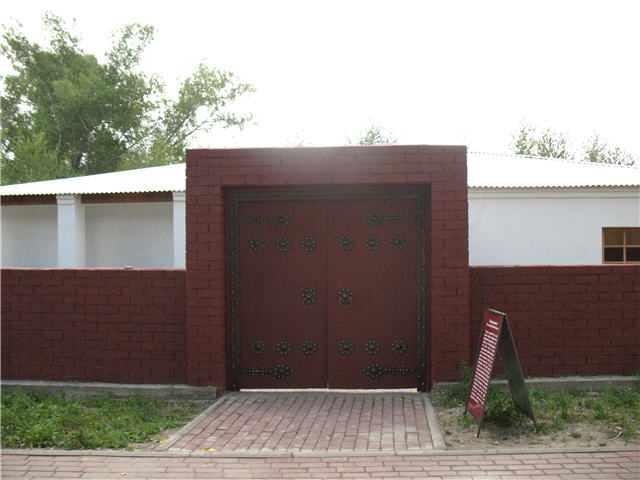| Кирпичная изгородь уйгурской усадьбы высотой 150 см. Ворота деревянные, открывающиеся внутрь двора. 13.07. 2011 г. | ||||