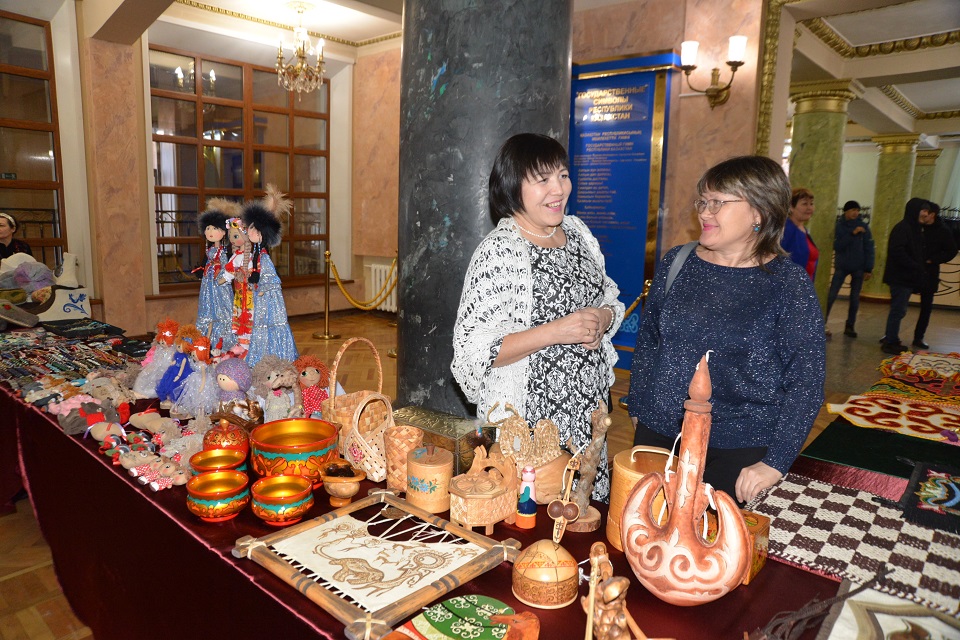 В выставке декоративно-прикладного искусства (ДПИ), проведенной перед заседанием «круглого стола», приняли участие отделы музея-заповедника. Отдел декоративно-прикладного искусства представил экспонаты из фондов музея, а мастера Игорь Мартынов, Ольга Полторанина, Юлия Костик и другие, которые давно сотрудничают с отделом, - свою продукцию из войлока, шпона, бересты и других материалов. Бахыт Кеншлиг – известный мастер по изготовлению казахских национальных инструментов, выставил домбры.